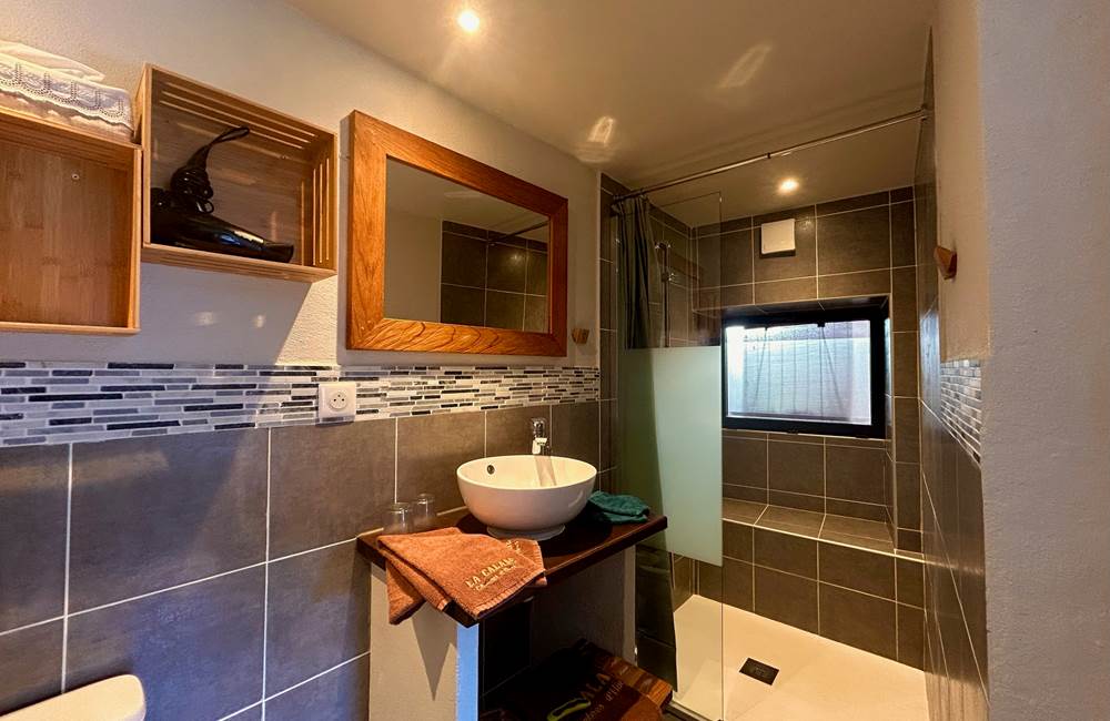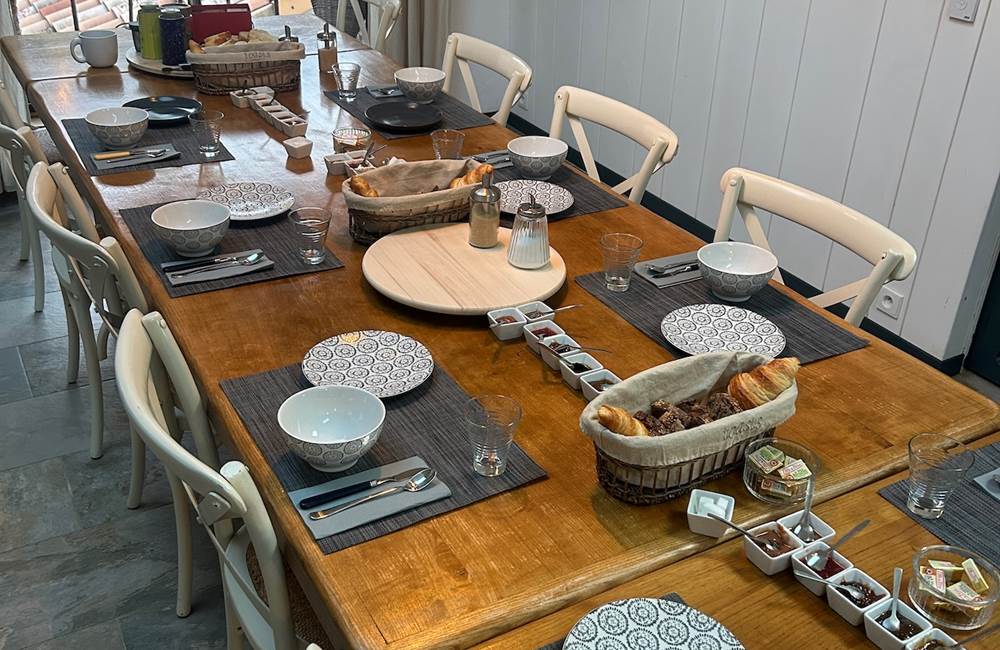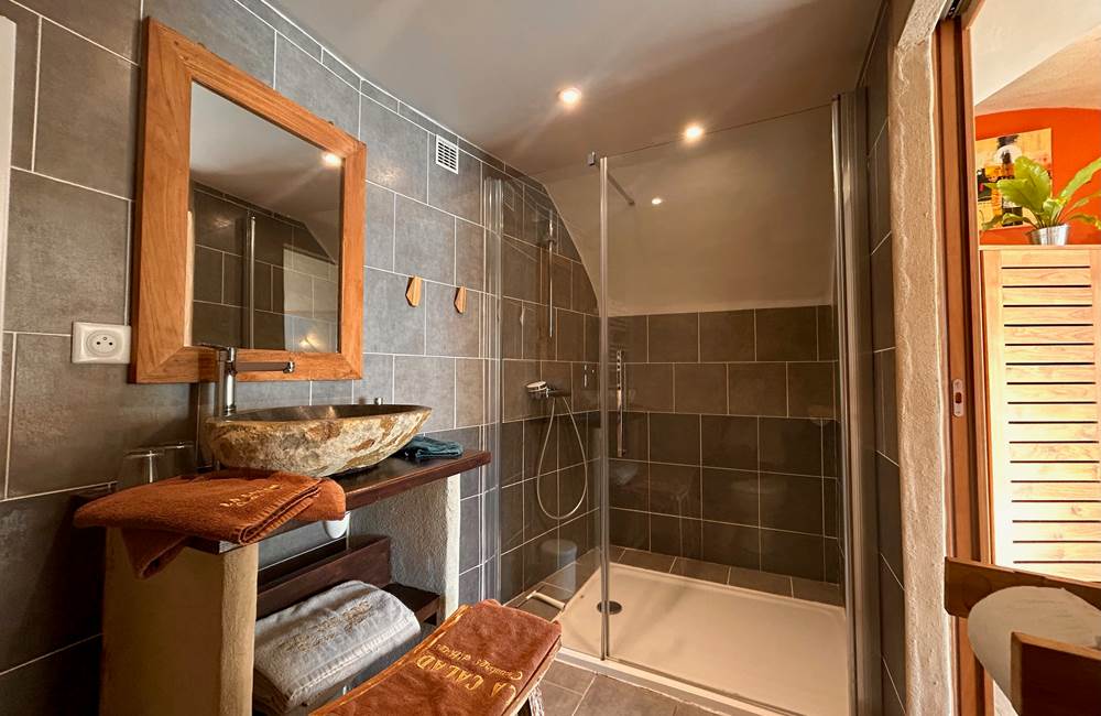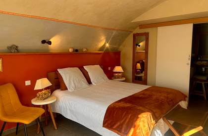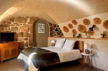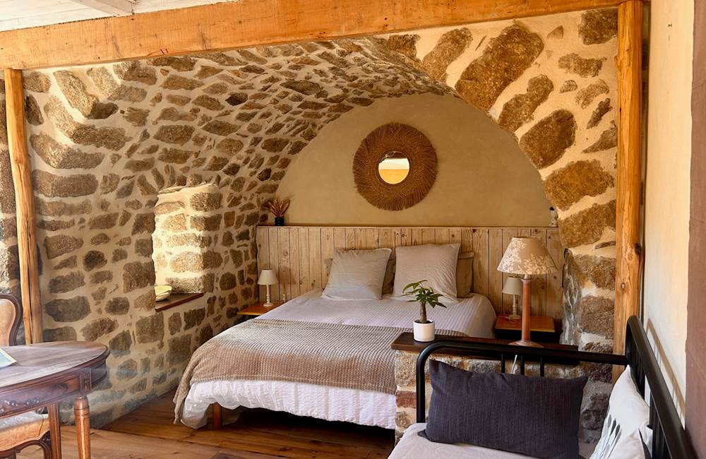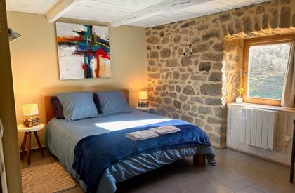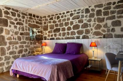 Perdue à 650 m d'altitude au cœur du parc naturel régional des Monts d'Ardèche, la maison plus que centenaire a gagné en lustre, au fil des restaurations réalisées avec brio. Les matières saines sont à l'honneur : la chaux, le bois et, bien sûr, les grosses pierres grises ardéchoises (murs épais, voûtes, linteaux) avec lesquelles on remblayait également les chemins des environs – les fameuses calades. Plusieurs terrasses sont aménagées pour profiter pleinement du panorama sur les monts verdoyants : une à l'abri du vent, une autre surplombant le potager bio avec une merveilleuse piscine tout récemment installée, et la plus belle, sorte de ponton s'élançant vers l'horizon, où Christian et Grégory, vos charmants hôtes, servent par beau temps le petit déjeuner avec pain bio, gâteau à la châtaigne, confitures maison, fromage de chèvre, fruits... Sinon, il est toujours possible de se replier dans la magnifique cuisine tout en bois clair et blanc. Les chambres sont assez grandes, confortables et mignonnes comme tout, avec des salles de bains originales. Cette adresse à prix modique est un vrai gage de silence, d'authenticité et de bien-être, grâce au sauna, au Jacuzzi et aux massages dispensés sur place. Un très joli spot où séjourner en Ardèche.