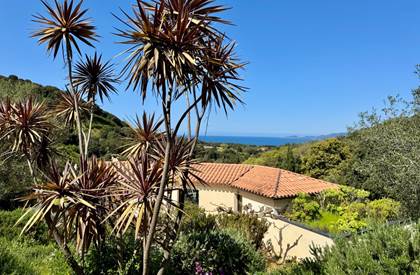 À vingt minutes d’Ajaccio, à mi-pente face au golfe de Sagone, ces deux maisons de construction récente ont tout pour plaire : vue de rêve, décoration actuelle, convivialité – au Ruone, on se sent bien. Vous y occuperez de très confortables chambres, toutes de plain-pied, avec, pour chacune, son coin terrasse et la vue sur la mer et le maquis. Côté décor, leur élégance contemporaine se teinte des plus jolis coloris du moment, et les salles de bains, magnifiques, se parent d’une douche à l’italienne. “Cargese”, la plus petite, est un vrai nid d’amoureux ; “Casaglione”, la plus pimpante, s’anime de touches de vert anis et d’une drôle d’armoire customisée. Une belle pièce à vivre, mêlant chaises et fauteuils design des années 1960, coquillages et gorgones, tableaux ethniques, semble faite pour les chaleurs estivales avec son sol en béton lissé. Si vous n’avez pas envie de descendre tout de suite à la plage (à trois minutes en voiture), une piscine grise dans laquelle se reflètent les variations du ciel vous attend au jardin. Et puis, il y a la grande terrasse face à la mer, où la joyeuse Laure sert les petits déjeuners. Pas de table d’hôtes, mais des restaurants pas loin, et les pique-niques sont autorisés dans le jardin (minifrigo dans chaque chambre). Des moments de bonheur à partager face au soleil couchant et qui donnent envie de revenir très vite...