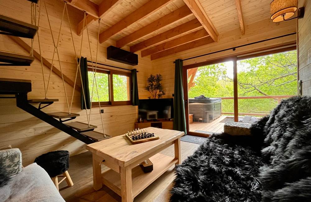 Chalet en hauteur de 50m2 avec mezzanine, jusqu'à 4 personnes, spa privatif, cuisine équipée.